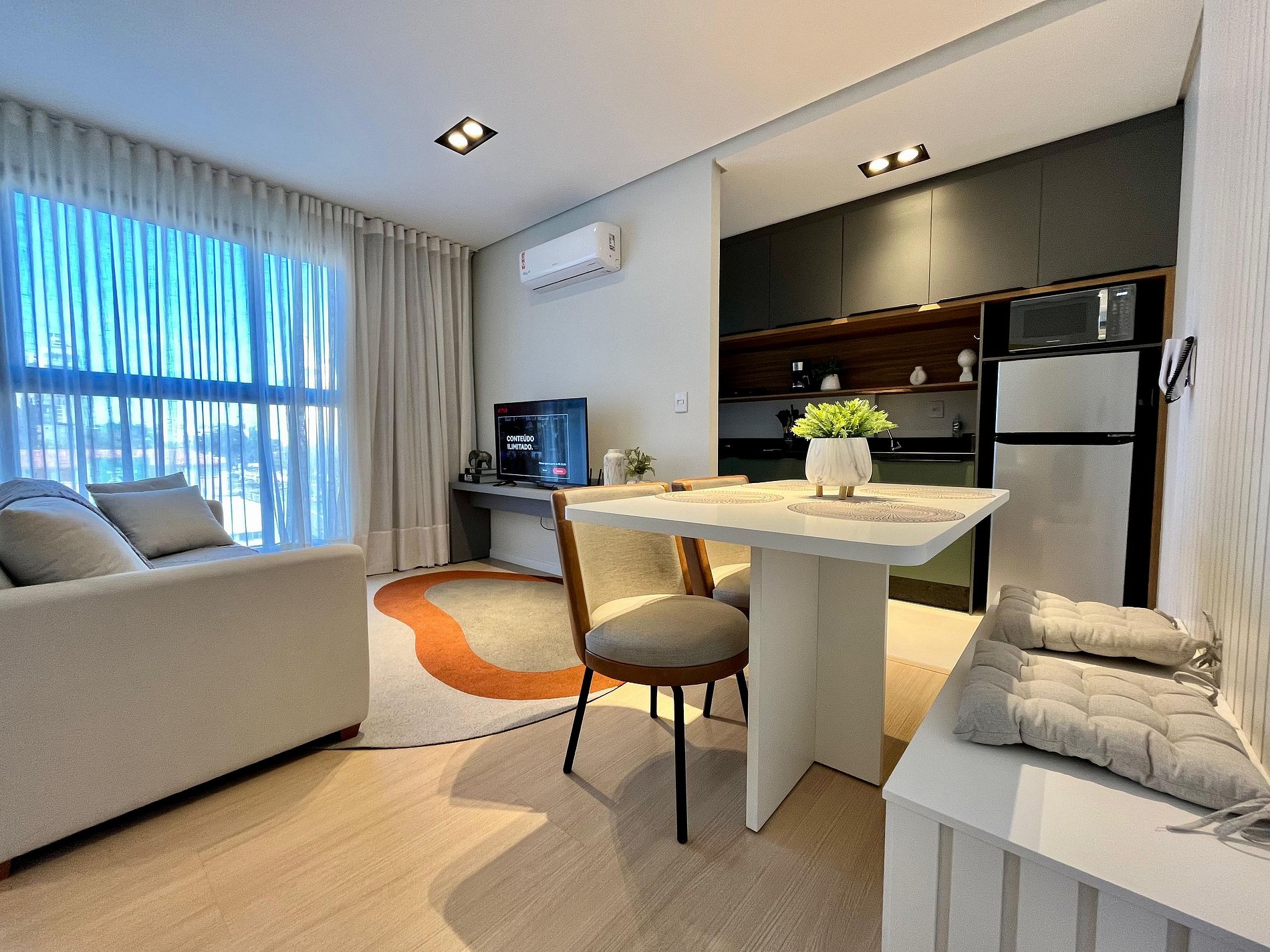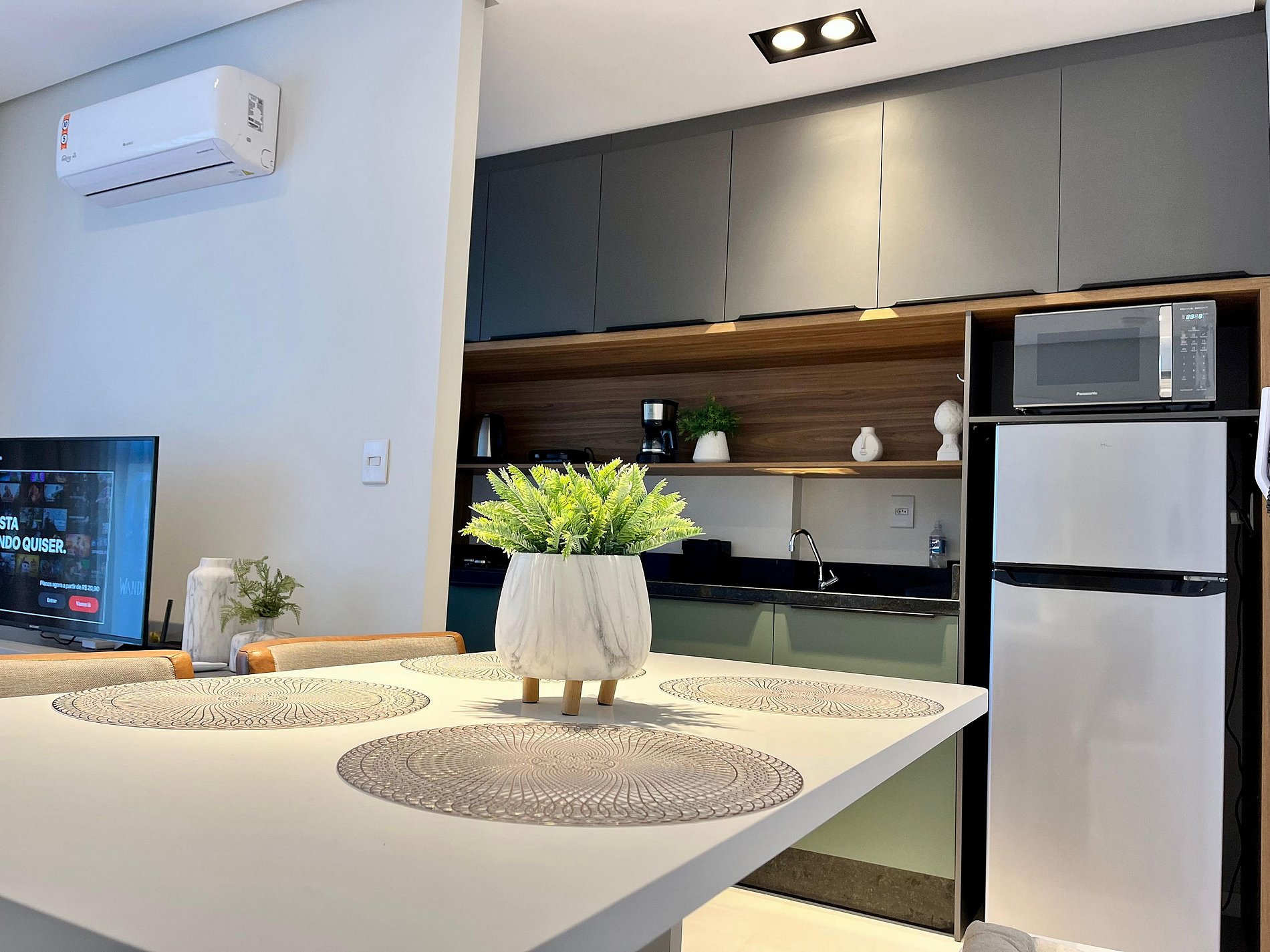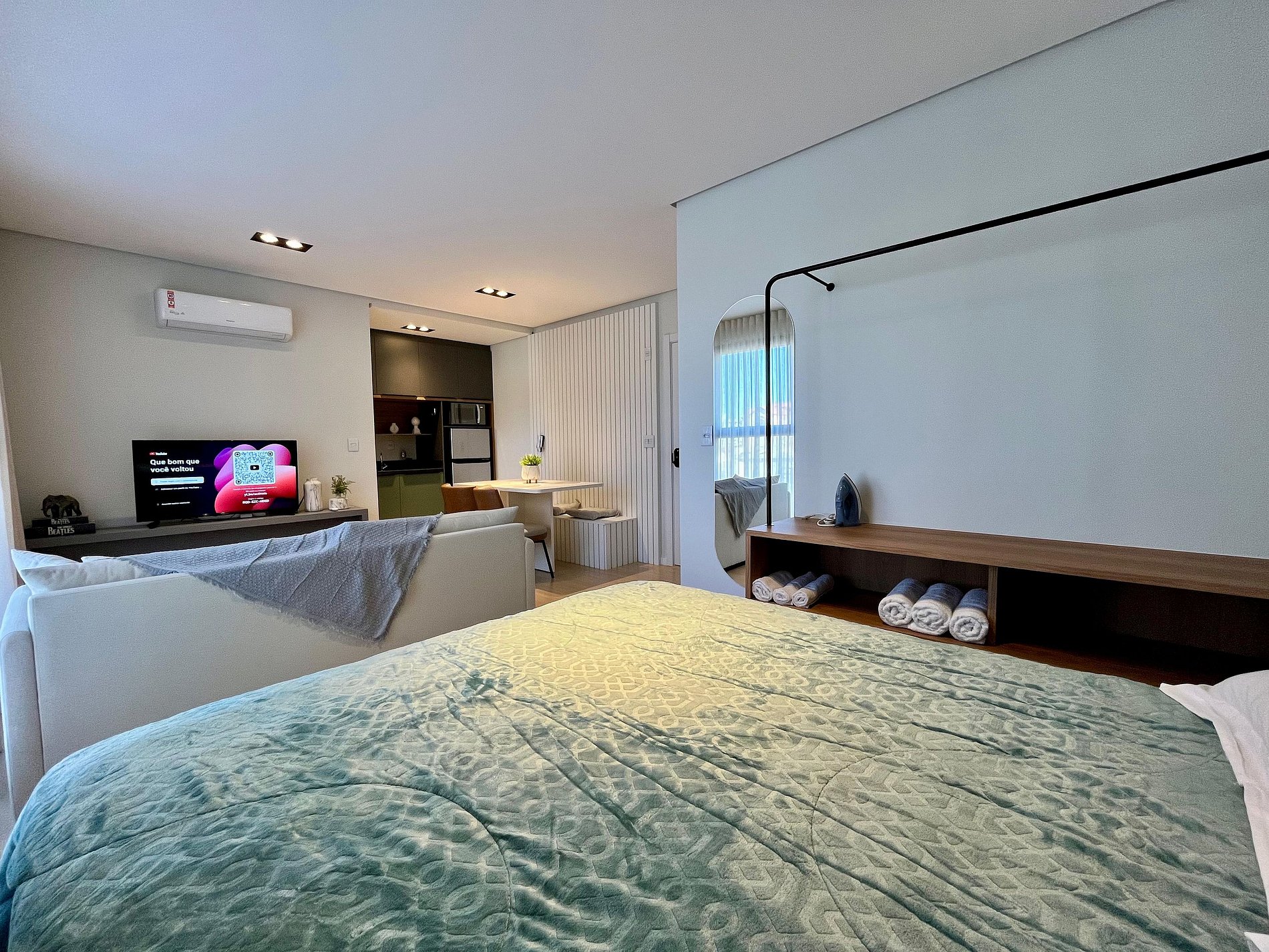 Este studio foi pensado para oferecer conforto, praticidade e uma experiência agradável. Equipado com ar-condicionado, TV 43", cama box, sofá-cama e cozinha completa com eletros e utensílios.