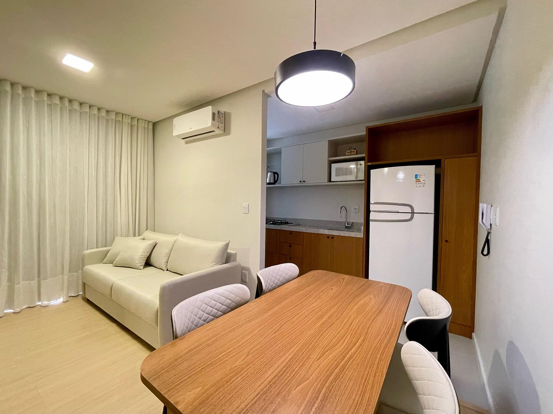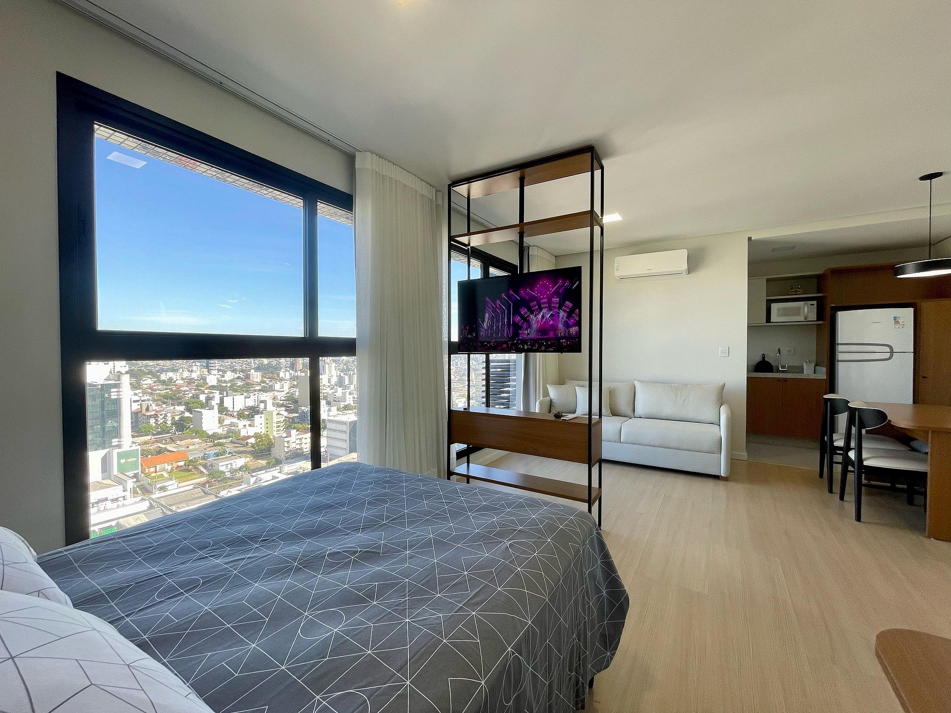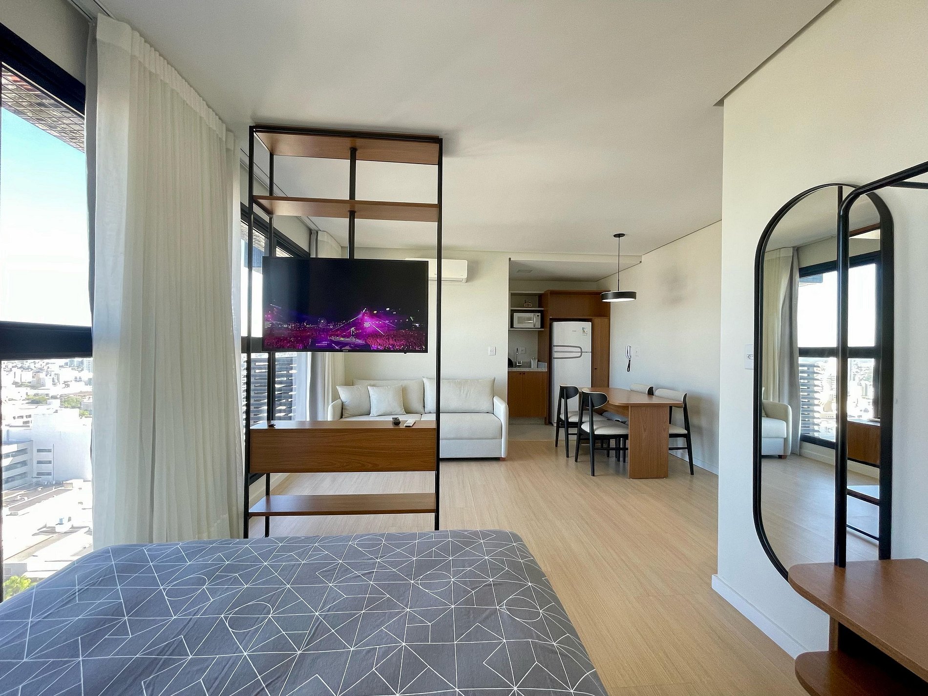 Studio ideal para casais, viajantes solos ou profissionais em viagem de negócios. Com ambientes integrados, iluminados por janelas amplas e cortinas blackout, oferece sala com sofá confortável e TV Smart, além de ar-condicionado para garantir o clima ideal. A cozinha é totalmente equipada com cooktop, micro-ondas, geladeira, chaleira elétrica e utensílios essenciais, acompanhada por uma charmosa mesa de jantar. Conta ainda com área de serviço separada, piso vinílico que traz sofisticação e conforto, decoração minimalista e Wi-Fi de alta velocidade. Próximo a comércios, restaurantes e transporte público, o espaço é perfeito para quem busca praticidade, conforto e estilo em uma só estadia.