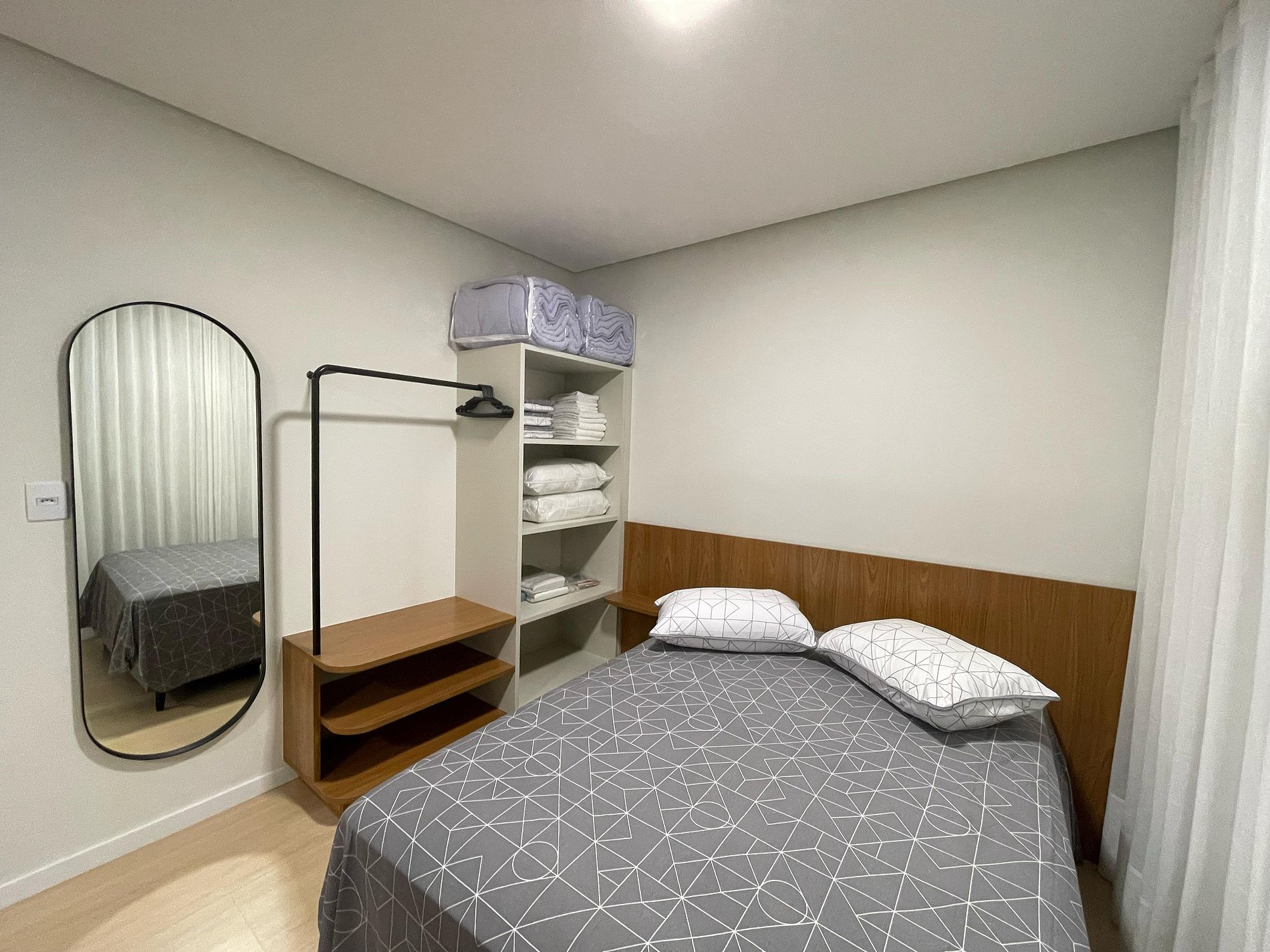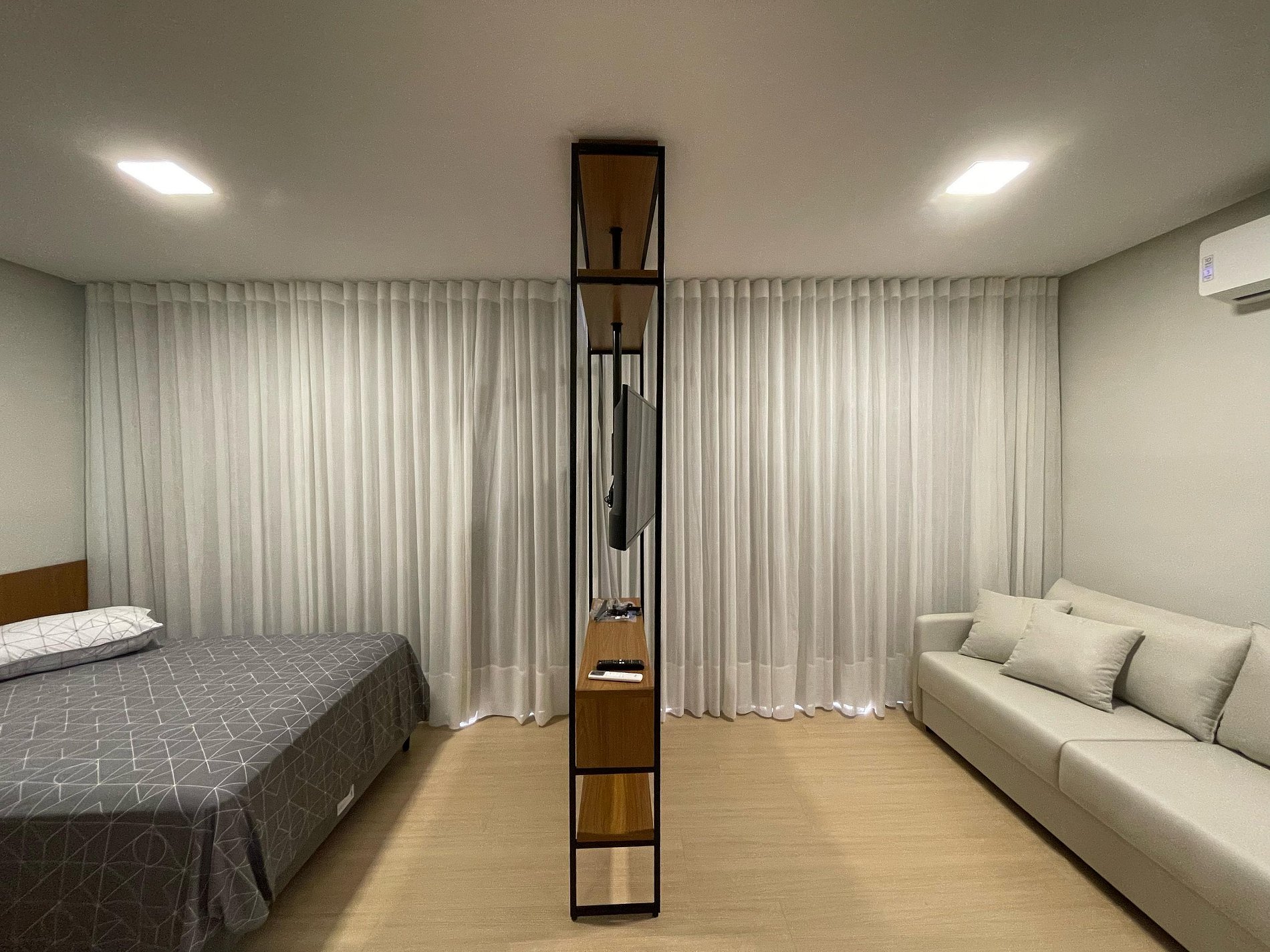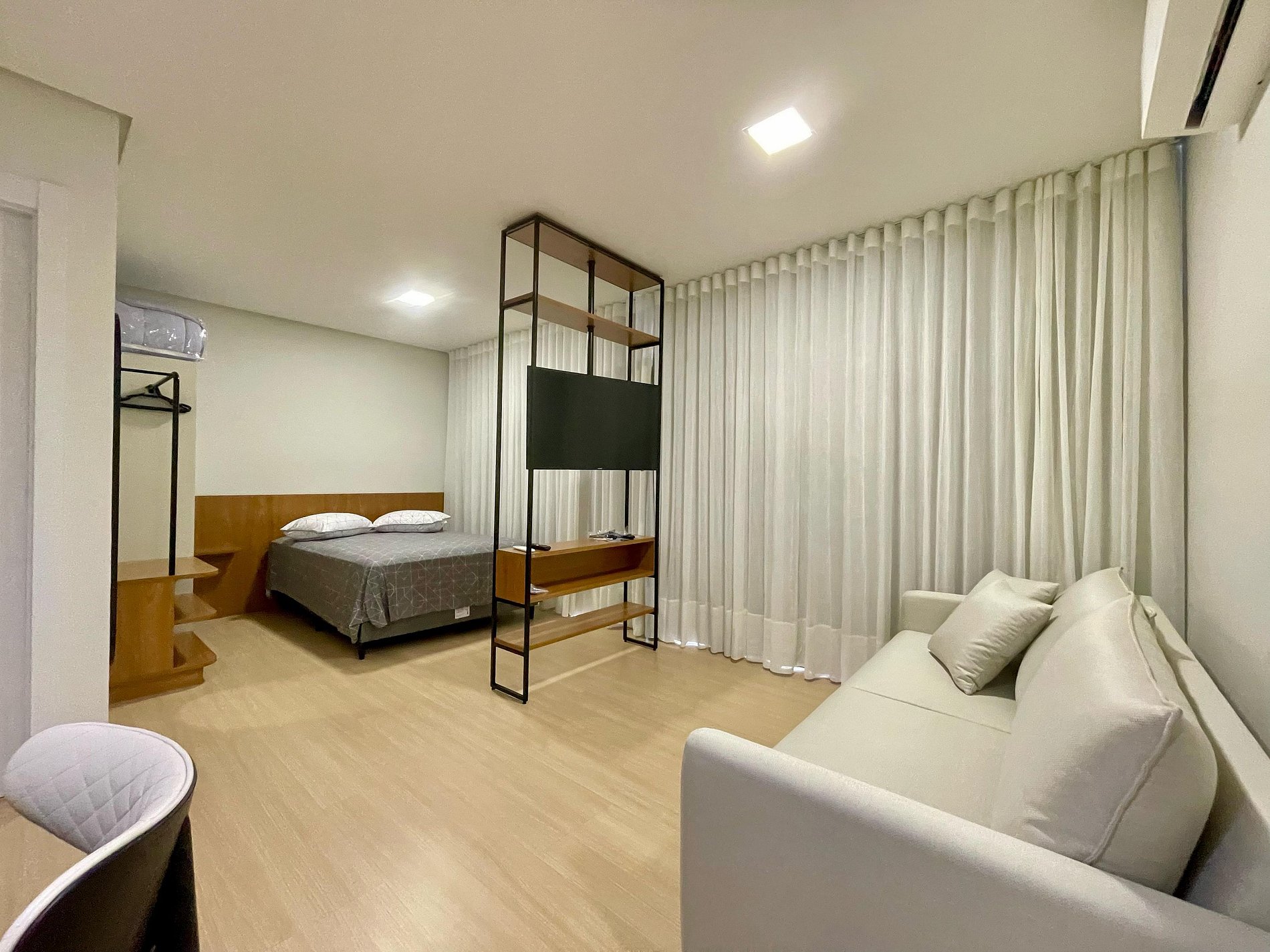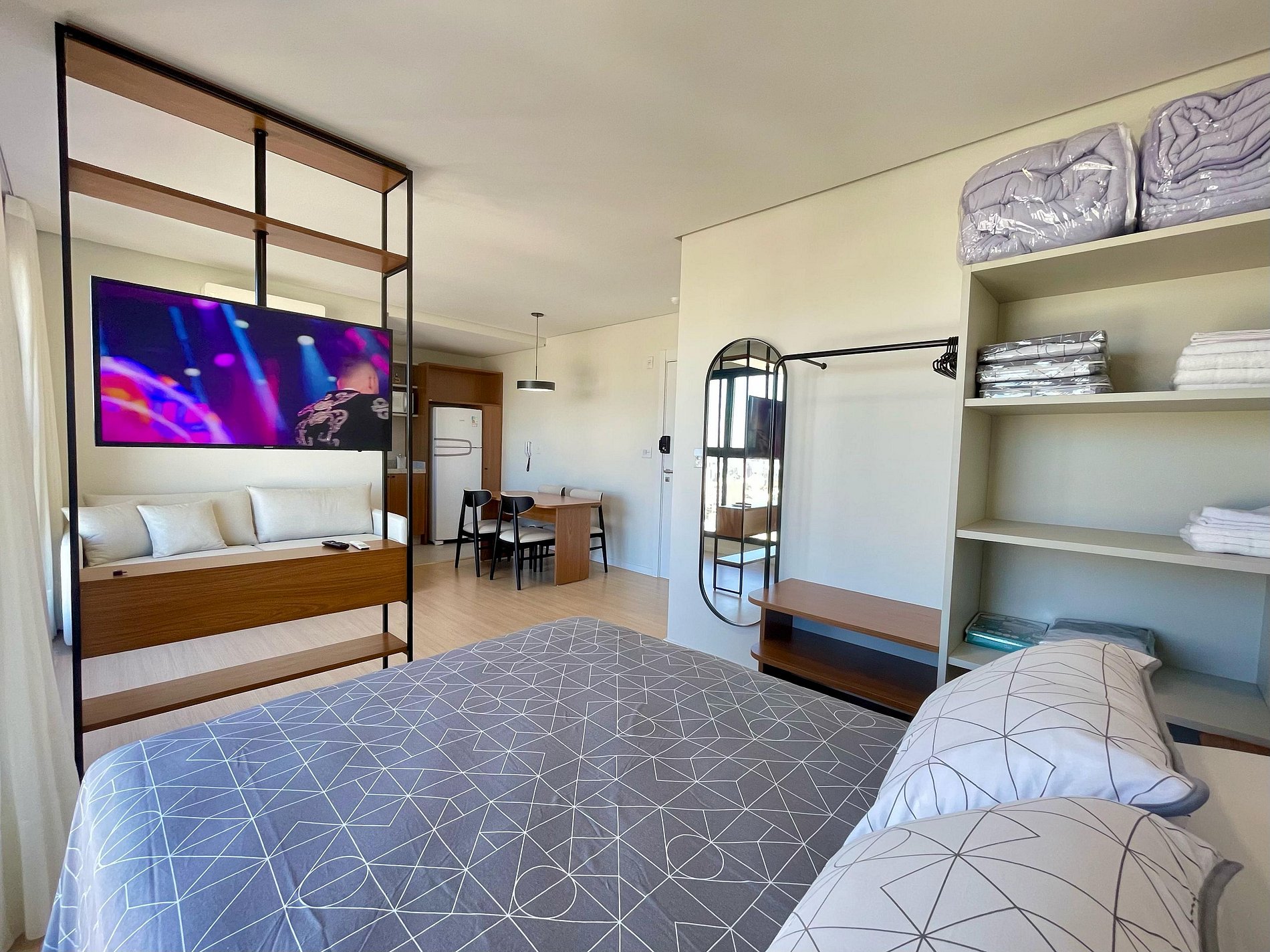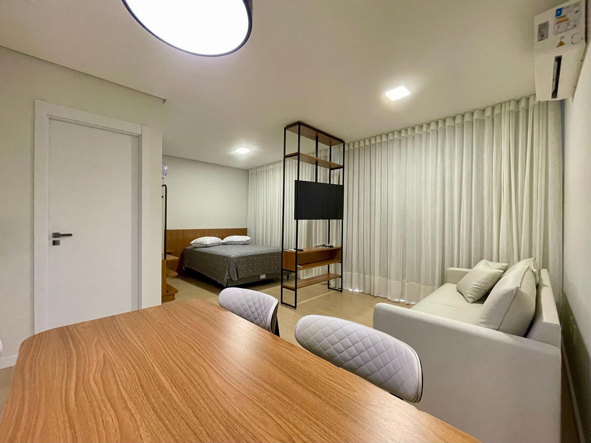 Studio ideal para casais, viajantes solos ou profissionais em viagem de negócios. Com ambientes integrados, iluminados por janelas amplas e cortinas blackout, oferece sala com sofá confortável e TV Smart, além de ar-condicionado para garantir o clima ideal. A cozinha é totalmente equipada com cooktop, micro-ondas, geladeira, chaleira elétrica e utensílios essenciais, acompanhada por uma charmosa mesa de jantar. Conta ainda com área de serviço separada, piso vinílico que traz sofisticação e conforto, decoração minimalista e Wi-Fi de alta velocidade. Próximo a comércios, restaurantes e transporte público, o espaço é perfeito para quem busca praticidade, conforto e estilo em uma só estadia.