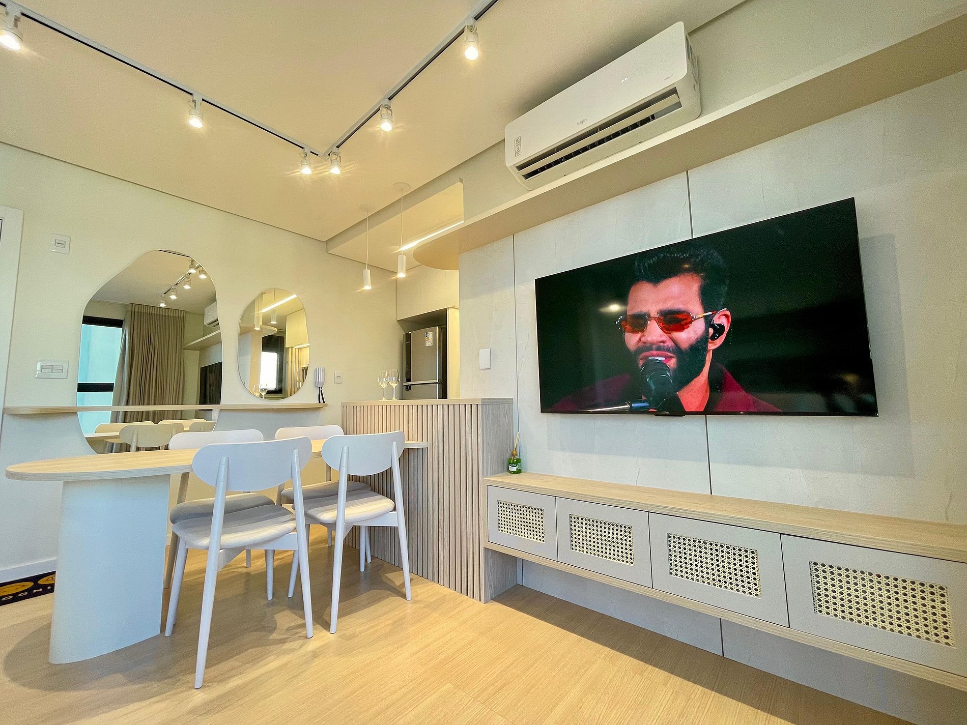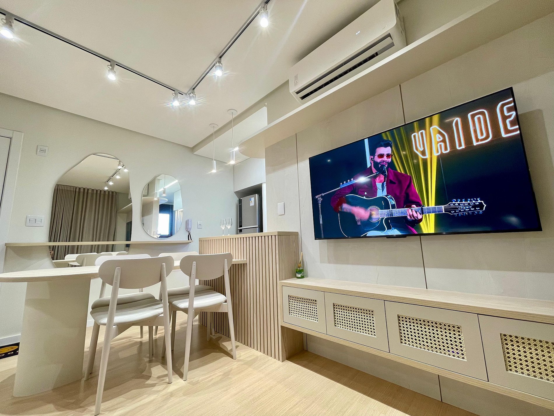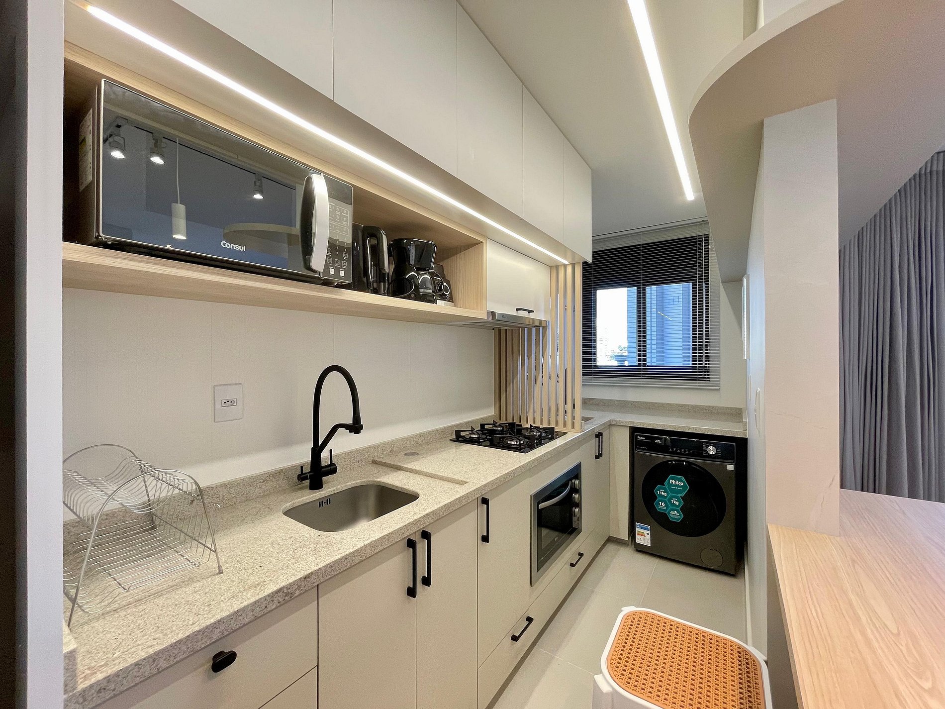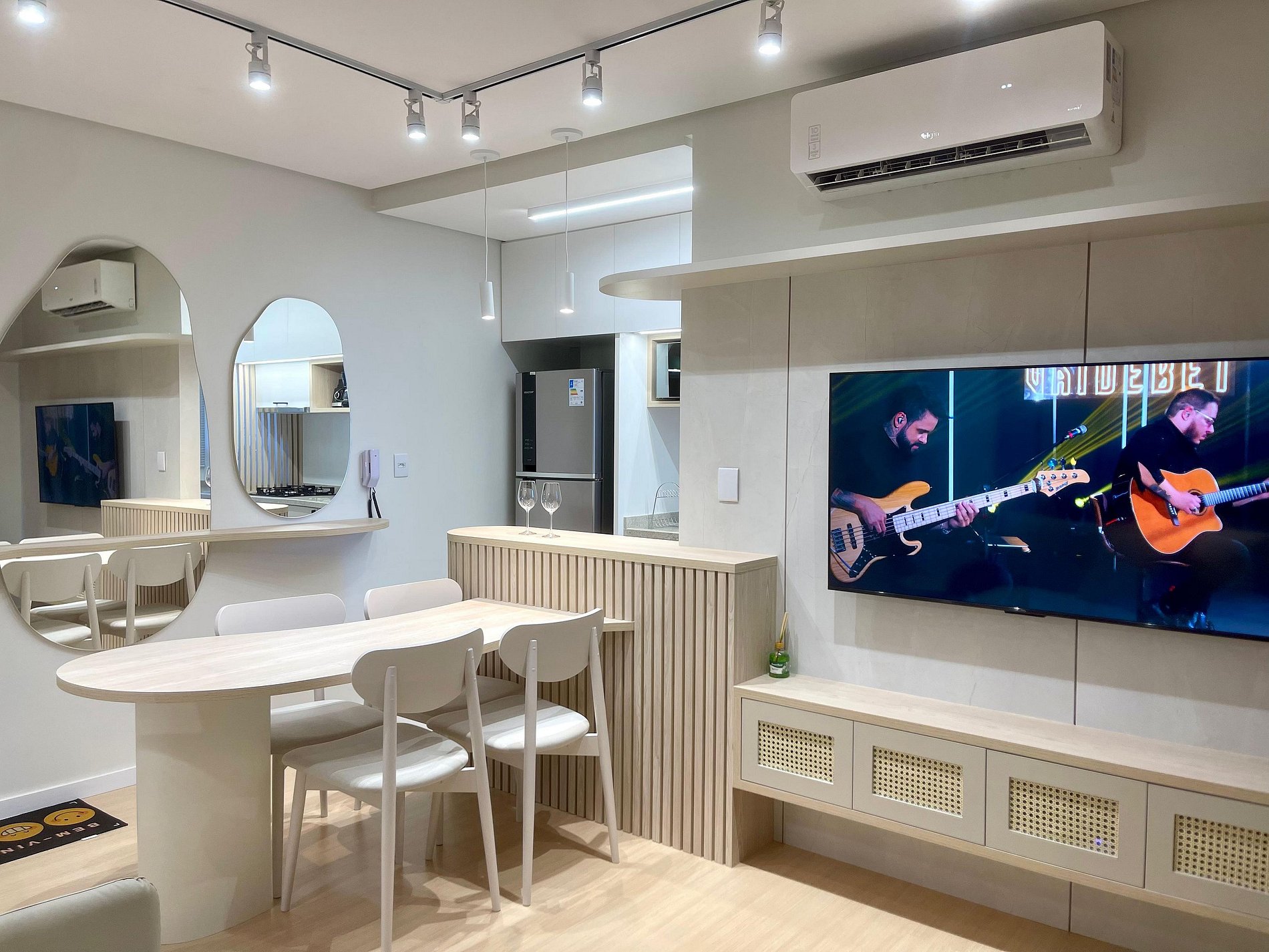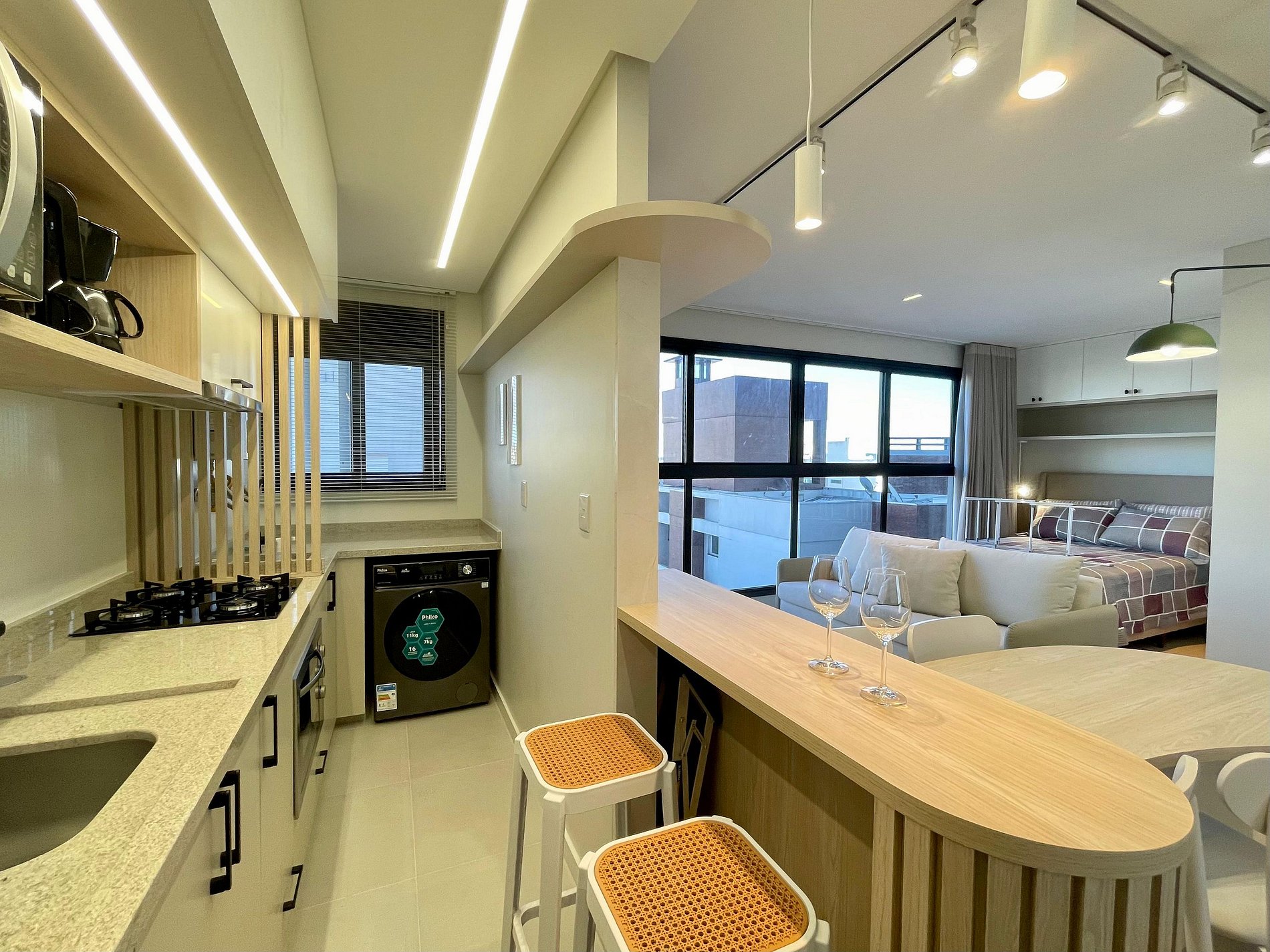 Studio ideal para casais, viajantes solos ou profissionais em viagem de negócios. Com ambientes integrados, iluminados por janelas amplas e cortinas blackout, oferece sala com sofá confortável e TV Smart, além de ar-condicionado para garantir o clima ideal. A cozinha é totalmente equipada com cooktop, micro-ondas, geladeira, chaleira elétrica e utensílios essenciais, acompanhada por uma charmosa mesa de jantar. Conta ainda com área de serviço separada, piso vinílico que traz sofisticação e conforto, decoração minimalista e Wi-Fi de alta velocidade. Próximo a comércios, restaurantes e transporte público, o espaço é perfeito para quem busca praticidade, conforto e estilo em uma só estadia.