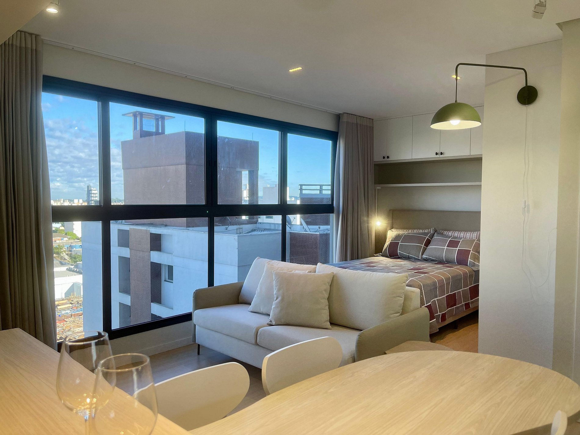 Studio ideal para casais, viajantes solos ou profissionais em viagem de negócios. Com ambientes integrados, iluminados por janelas amplas e cortinas blackout, oferece sala com sofá confortável e TV Smart, além de ar-condicionado para garantir o clima ideal. A cozinha é totalmente equipada com cooktop, micro-ondas, geladeira, chaleira elétrica e utensílios essenciais, acompanhada por uma charmosa mesa de jantar. Conta ainda com área de serviço separada, piso vinílico que traz sofisticação e conforto, decoração minimalista e Wi-Fi de alta velocidade. Próximo a comércios, restaurantes e transporte público, o espaço é perfeito para quem busca praticidade, conforto e estilo em uma só estadia.