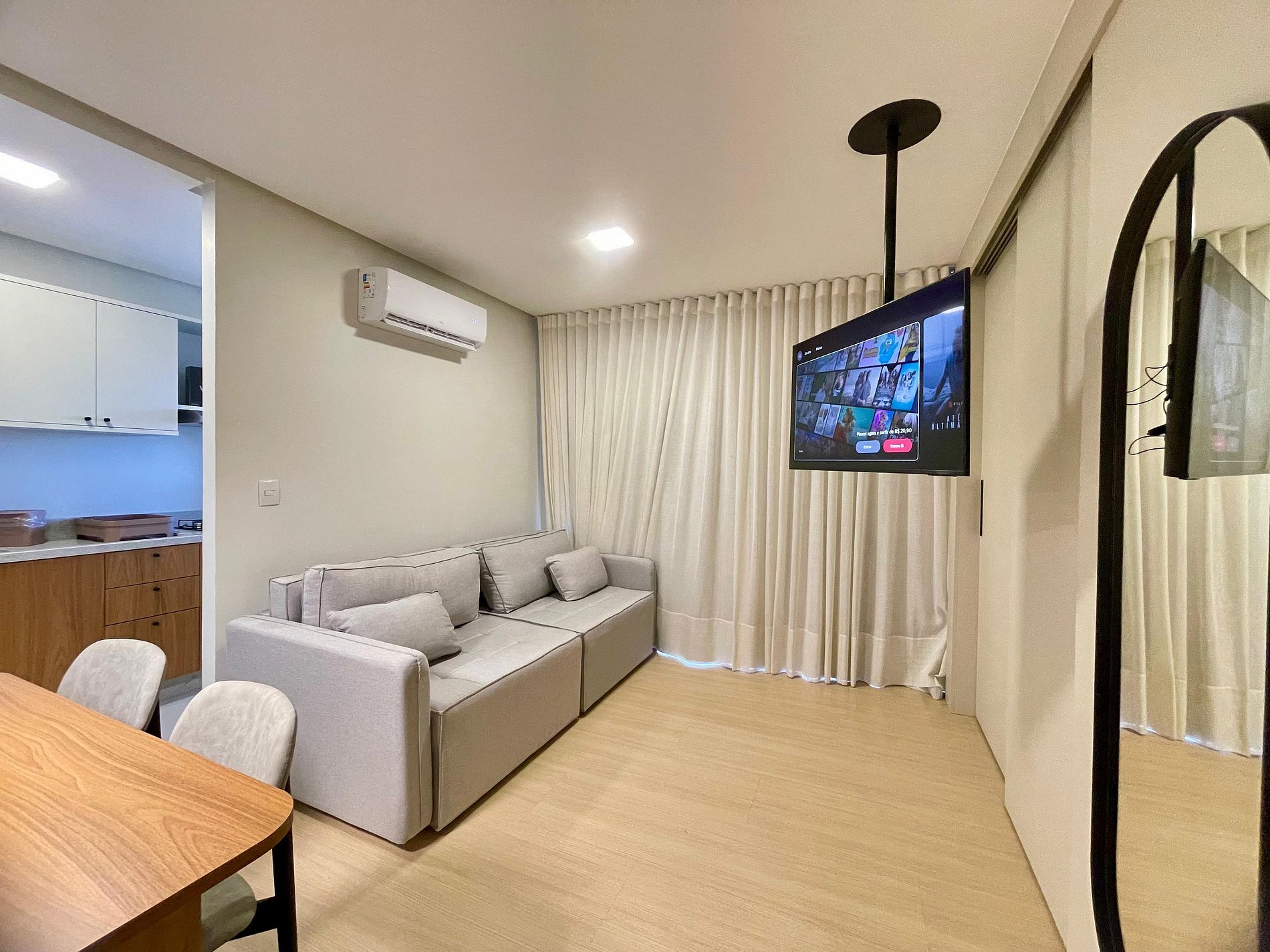 O studio oferece um ambiente aconchegante e bem planejado. A área do quarto conta com uma divisória que garante mais privacidade, ideal para descansar com conforto. A sala possui um sofá confortável, perfeito para relaxar após um dia de passeio ou trabalho.